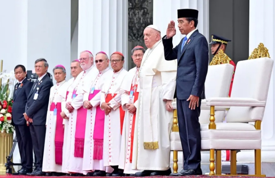 جاكرتا، ٤ سبتمبر ٢٠٢٤ – استقبل الرئيس جوكو ويدودو (جوكوي) بشكل مباشر قدوم زعيم الكنيسة الكاثوليكية العالمية، البابا فرانسيس، في قصر الدولة بوسط جاكرتا. وفي هذه اللحظة التاريخية، ظهر جوكوي وهو ينحني ويصافح البابا بحرارة.